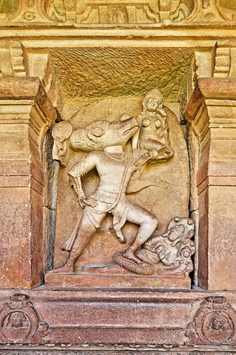Varaha est représenté ici avec un corps anthropomorphe, avec seulement une tête de sanglier. Son pied gauche est posé sur un serpent, sans doute Ananta qui a un buste humain et est acompagné d'un autre serpent à tête humaine. Varaha porte la Terre sur son coude gauche comme à Badami.(E. Parlier-Renault, 2006).