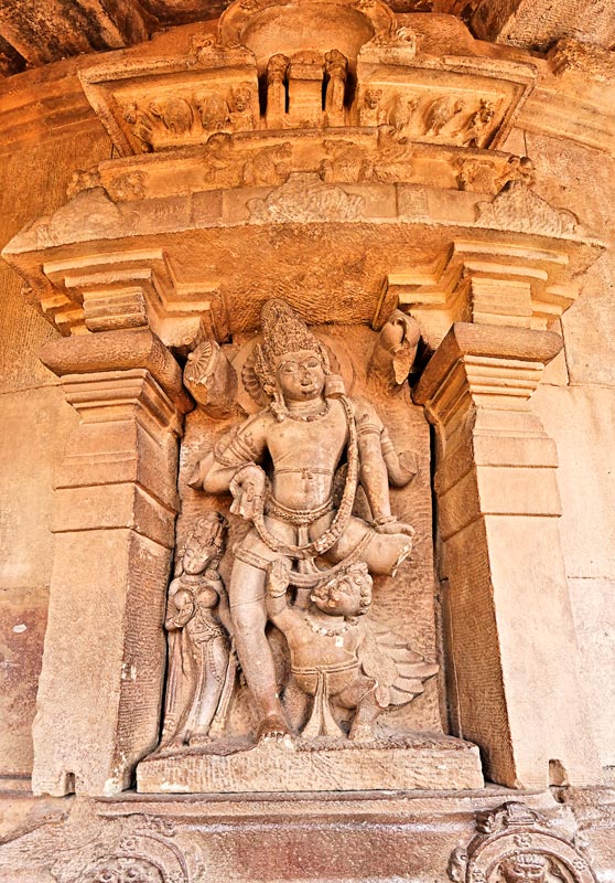 Vishnu est représenté en compagnie de Garuda et sans doute de Laksmi. Il a quatre bras. Ses attributs sont le dique à sa droite et la conque à sa gauche. (E. Parlier-Renault, 2006).