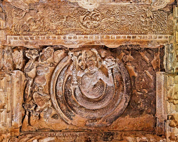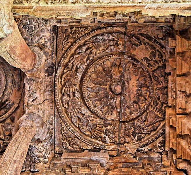 Cette roue ou cakra est sculptée au plafond comme dans la grotte 2 de Badami. : les rayons sont des poissons. Le cakra (roue, disque) est un des attributs principaux de Vishnu. (A.M. Loth, 2003). C'est un symbole solaire, lumineux, que Vishnu aurait reçu de Shiva. (E. Parlier-Renault, 2006). Ici elle est entourée d'une guirlande de fleurs de lotus.
