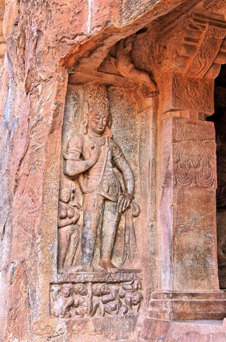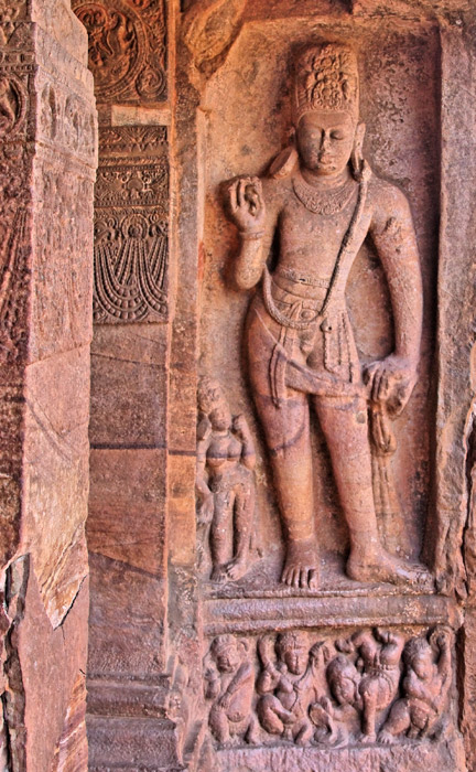 Cette caverne est gardée aux deux extrémités par deux grands dvarapala, gardiens de porte débonnaires qui tiennent une fleur dans leur main droite. Ils sont accompagnés de petites figures féminines (A.M. Loth, 2006).