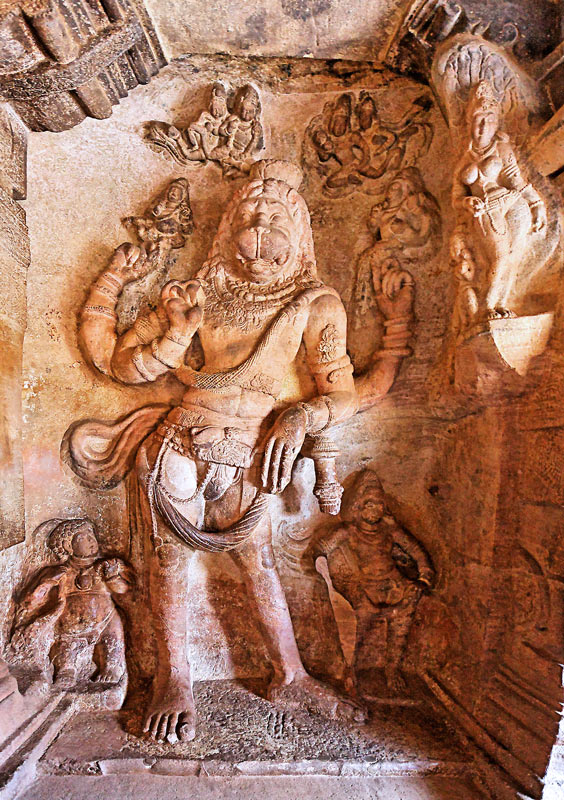 Cette sculpture monumentale le représente de face, hanché, sa monture Garuda à sa gauche et le bras avant gauche appuyé sur sa massue maintenant disparue . Les mains de ses seconds bras tiennent le disque et la conque sous leur aspects personnifiés. A sa droite, sans doute une représentation d'Omkara, la syllabe OM personnifiée. (A.M. Loth, 2003).