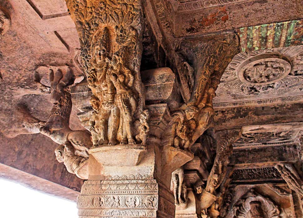 Un des couples sculptés sur les piliers. Un autre lion cornu soutenu par un gnome a été sculpté sur la face avant du pilier et une figure féminine sur la face arrière.