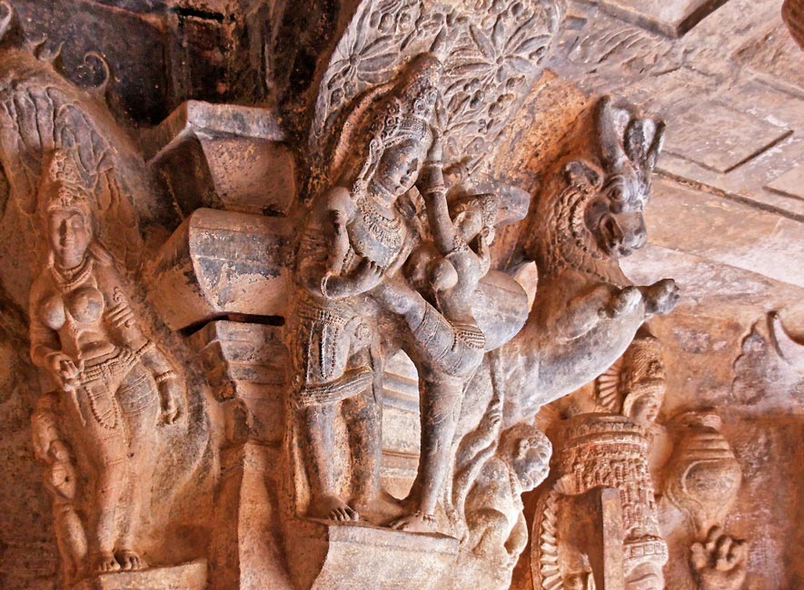 Les faces latérales des piliers sont ornées de grands haut-reliefs qui représentent des couples, le plus souvent des génies agrestes. Sur celui-ci, devant la face antérieure, jaillit un lion cornu, en ronde bosse, soutenu par un gnome. On peut voir en haut à droite les caissons qui ornent le plafond comportant un dieu au centre entouré de divinités secondaires ( cf. la partie sur les dieux de l'espace). (A.M. Loth, 2006).