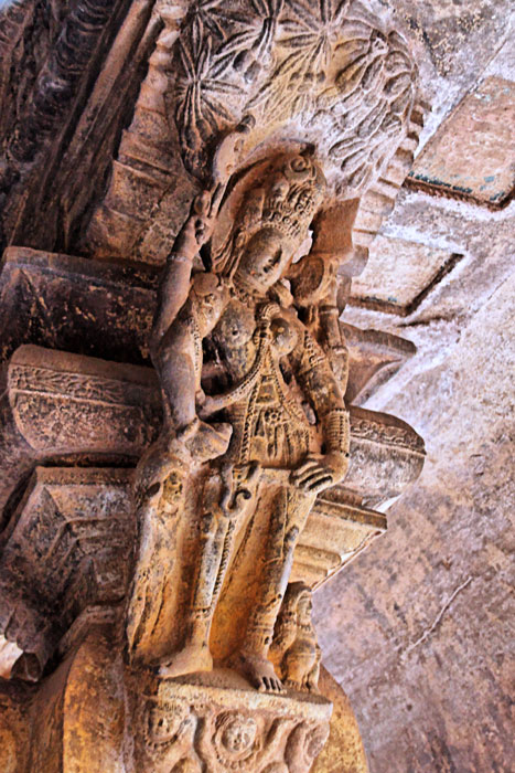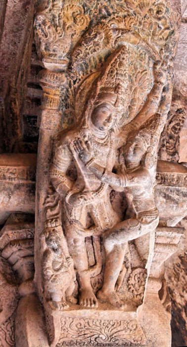 Shiva sous sa forme androgyne est sculpté sur un des piliers. Sa moitié masculine est à sa droite, sa 2ème main tenant la hache. Sa 2ème main féminine tient un miroir.(A.M. Loth, 2006)
