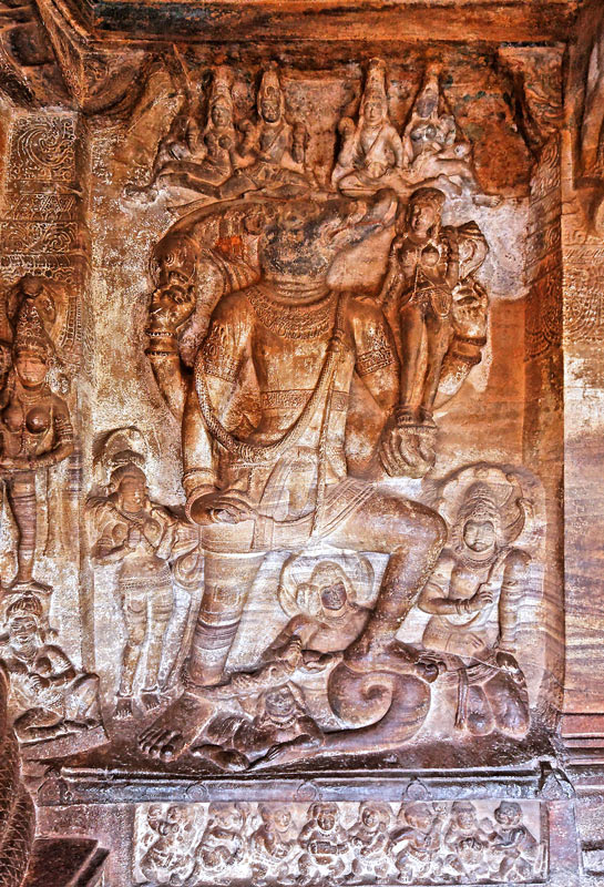 Cette sculpture de Varaha, 3ème avatara de Vishnu, se trouve à côté de la représentation de Vishnu sur Ananta. Varaha est représenté ici avec un corps anthropomorphe, avec seulement une tête de sanglier. Son pied gauche est posé sur un serpent, sans doute Ananta sur lequel Vishnu sommeille