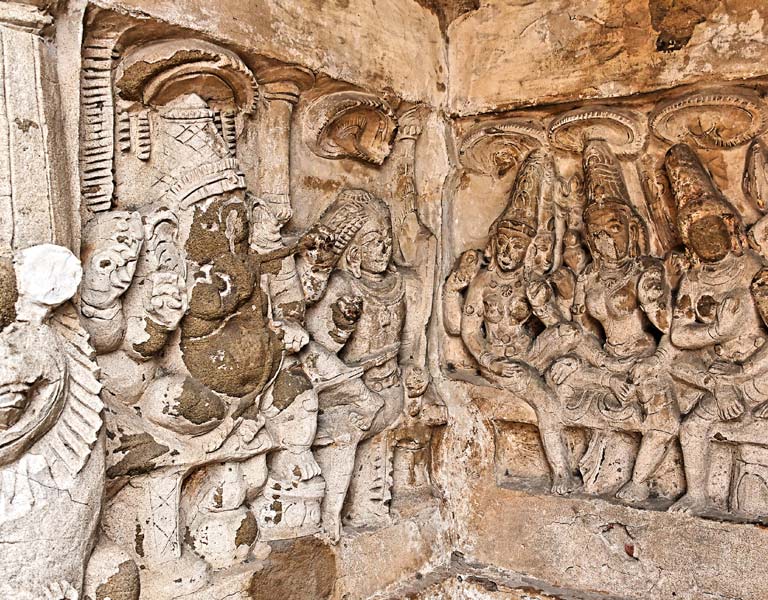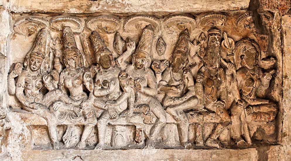 Cette sculpture se trouve contre le mur nord entre les chapelles 26 et 28. Elle représente les Sept Déesses Méres ou Sapta Matrika : Brahmani, Vaishnavi, Maheshvari, Indrani, Kaumari, Varahi et Chamunda . Les Sept Mères sont les énergies des grands dieux. Elles ont les mêmes attributs et les mêmes montures que leurs dieux respectifs. Elles jouent un grand role dans différents récits, et en particulier dans les chants du Devi-Mahatmya relatant la lutte de Parvati sous la forme d'Ambika contre deux frères asura. C'est au cours de ce combat que Kali au visage terrifiant sortit du front d'Ambika et tua deux généraux asura, Canda et Munda, et ainsi fut surnommée Camunda. Comme la puissance des démons augmentait, des dieux sortirent de puissantes énergies sous la forme des Sept Mères pour combattre l'armée des démons. A la fin du combat, les Sept Mères énergies se fondirent dans Ambika qui tua le grand démon Shumbha en combat singulier. (A.M. Loth, 2003). Chamunda (ou Camunda) est appelée également Kali. Cette dernière est la forme la plus redoutable de la déesse et elle est représentée ici à droite sur la scène. Les matrika sont souvent représentées avec Ganesh, comme ici dont la sculpture se trouve sur la gauche.