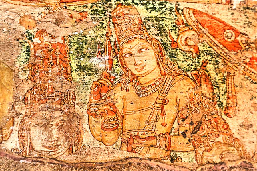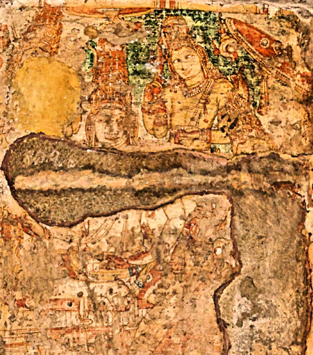 C'est dans un renfoncement entre deux chapelles que se trouve cette peinture. Au centre, Shiva est en position de yogin, la main en coupe sur ses genoux. A sa gauche, Vishnu est reconnaissable à son disque et à sa conque. A sa droite, sans aucun doute Brahma.