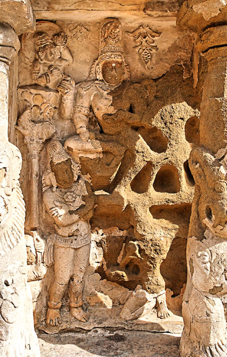 Kama est debout, à gauche. Derrière lui, son étendard est tenu par un gana. La figure à genoux en dessous de Shiva est peut-être la femme de Kama implorant le pardon de Shiva pour qu'il ressucite son époux.