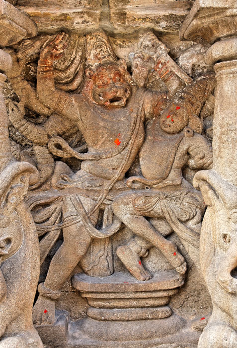 L'homme-lion, le 4ème des 10 avatars de Vishnu qui prend cet aspect pour mettre à mort le démon Hiranyakashipu. Ce dernier avait obtenu des dieux de ne pouvoir être vaincu ni par un homme, ni par un animal, ni à l'intérieur, ni à l'extèrieur, ni de jour, ni de nuit, ni par aucune arme. Mais il se rendit tellement pénible aux dieux que Vishnu décida d'intervenir. Il se cacha dans un pilier, apparut au crépuscule comme homme-lion et le déchira de ses griffes (E. Rudy Jansen, 1995).