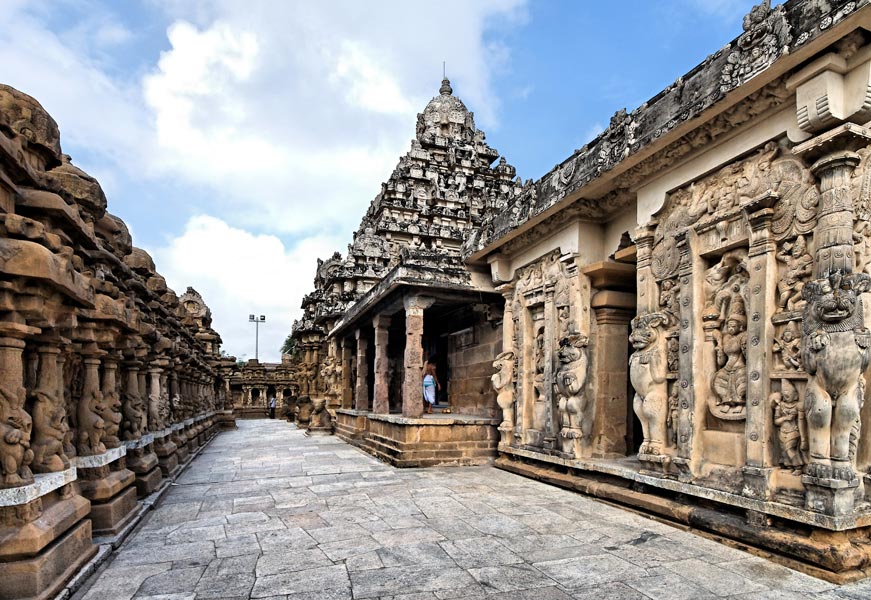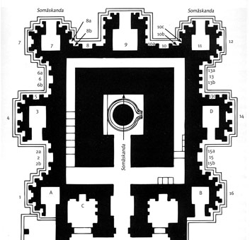 A gauche, les chapelles du mur sud de l'enceinte se succèdent. A l'origine, le temple était constitué de deux parties : le mandapa et le sanctuaire (ou cella) proprement dit. Au XVIème siècle, une salle intermédiaire fut rajoutée entre les deux. Le culte est à nouveau célébré dans le temple: on voit sur la photo les officiants devant la porte. Les touristes peuvent entrer dans la partie précédant la cella, mais ne peuvent pas photographier le Linga (ou lingam) de basalte à 16 faces protégé par un Somaskanda. Le sanctuaire de base carrée est surmonté d'un vimana orné d'une profusion de motifs.