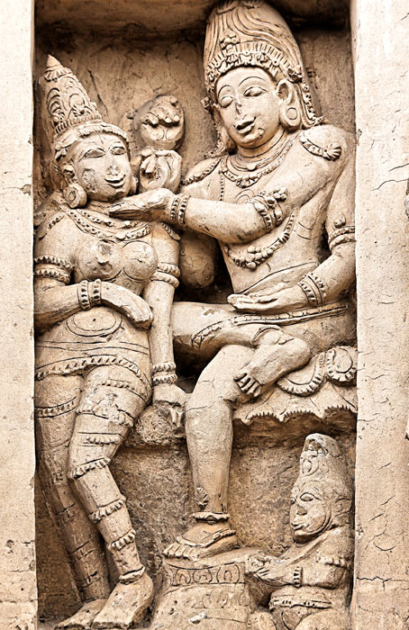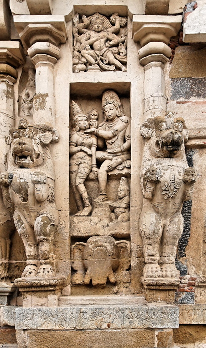 Cette première scène du sanctuaire, comme la scène suivante, illustre la primauté des images représentant le couple Shiva-Parvati sur les autres formes de Shiva. Dans toute l'iconographie du temple, la déesse mariée s'oppose à la déesse guerrière. (E. Parlier- Renault, 2006). Au dessus de la niche principale, Shiva danse la danse alidha, posture guerrière.