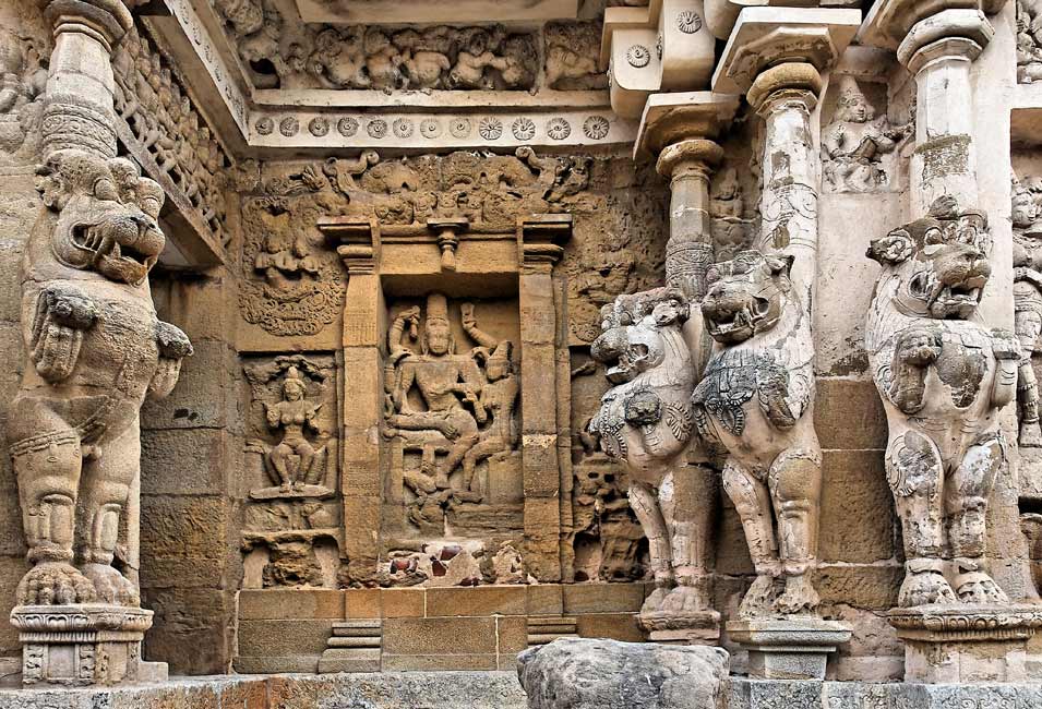 Le couple Shiva-Parvati est encadré par une représentation de Lakshmi à gauche de l'image et de Parvati (non visible). Ici Shiva a six bras, avec différents gestes. Parvati est assise de trois-quarts, avec deux bras, dans la position qu'elle occupe dans les Somaskanda (voir la description de l'enceinte). La scène montrant Lakshmi est identique à la représentation de Mahabalipuram (voir la partie sur la déesse).(E. Parlier-Renault, 2006).