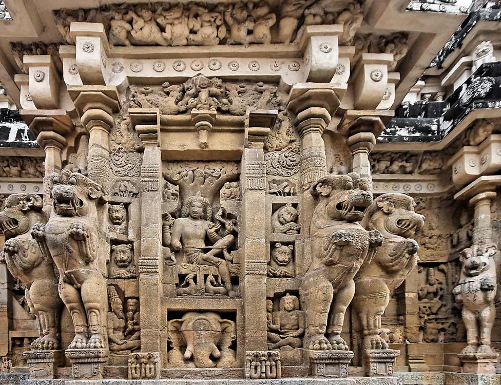 L'iconographie de la niche principale est enrichie par des reliefs sculptés. Dans cette chapelle médiane, la grande niche comprend Shiva en maître du yoga, Yoga-Daksina. Le dieu enseigne, la jambe gauche maintenue par un bandeau. Ses secondes mains tiennent le rosaire et le flambeau. Devant le siège, sont sculptées deux gazelles (ou antilopes) qui rappellent celles d'un sceau de Mohenjo daro ou celles du premier sermon du Bouddha. (A.M. Loth, 2003; voir aussi E. Parlier-Renault, 2006). Les lions semblent subjugués et des disciples l'écoutent. Dans les coins des ressauts, se dressent ces étranges lions cornus cabrés. Une autre représentation de cette forme de Shiva est sculptée dans une chapelle de l'enceinte côté nord. On aperçoit à gauche de l'image la scène de Parvati accompagnant la scène précédente.