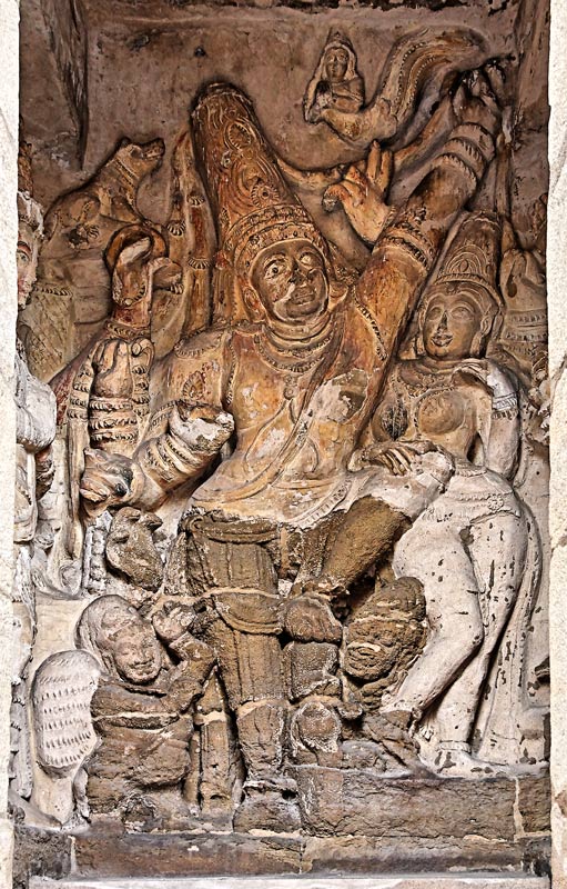 L'iconographie pallava innove en montrant Parvati en compagnie de Shiva. Parvati ne montre ici aucun signe de jalousie. Cette scène est représentée quatre fois dans le temple, deux fois sur les murs du sanctuaire et deux fois dans les chapelles de l'enceinte. Ce thème a une importance particulière dans les temples pallavas du VIIème siècle. Il pourrait évoquer le rite de l'onction royale.(E. Parlier-Renault, 2006)