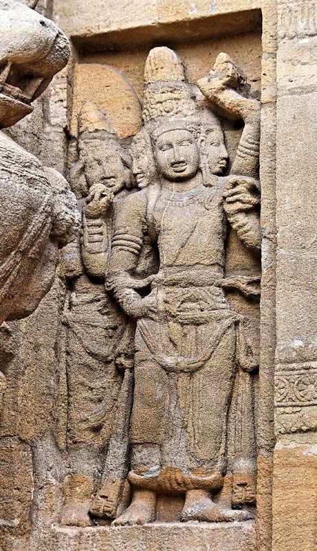 Cette représentation se trouve dans une niche secondaire à côté de la scène montrant la danse Lalatatikala. Trois des têtes de Brahma sont visibles. Il tient un livre dans une de ses mains gauches. A côté de lui, sans doute Sarasvati.