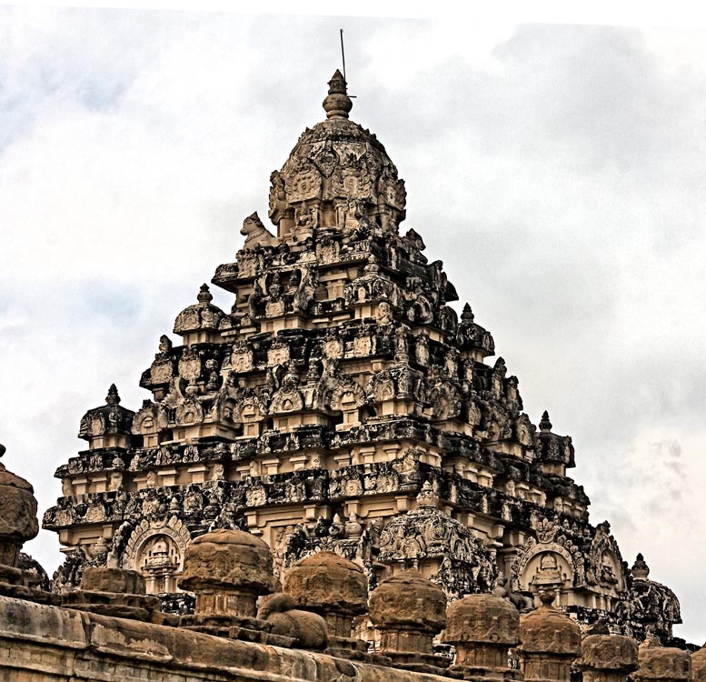 C'est une immense toiture à gradins ou à faux étages qui couvre la cella. Elle consiste en une répétition des mêmes motifs en les diminuant de façon progressive . A chaque angle, tous les 3 étages, se trouvent des édicules qui sont des images de temples élémentaires, ici avec un attique et un petit toit en forme de buble, reproduisant le motif du sommet (Dagens, 2009). Le toit est surmonté d'un attique supportant une couverture en bulbe. Aux côtés de cet édicule du sommet, 4 effigies de Nandi veillent..