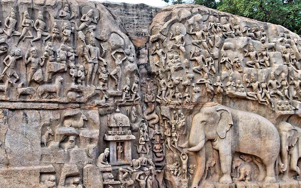 Ce bas relief grandiose de 30 mètres par 15 représente l'oeuvre la plus extraordinaire de Mahabalipuram. Il occupait le centre de l'agglomération et devait impressionner les marchands et les visiteurs qui arrivaient du port. Sa réalisation se situe au début du VIIème siècle lors du règne de Narasimhavarnam Ier. Son interprétation fait débat : s'agit-il de la descente du Gange, représenté dans la faille du milieu ou du célébre épiosde du Mahabharata au cours duquel Shiva donne l'arme divine à Arjuna? Peut-être les deux.