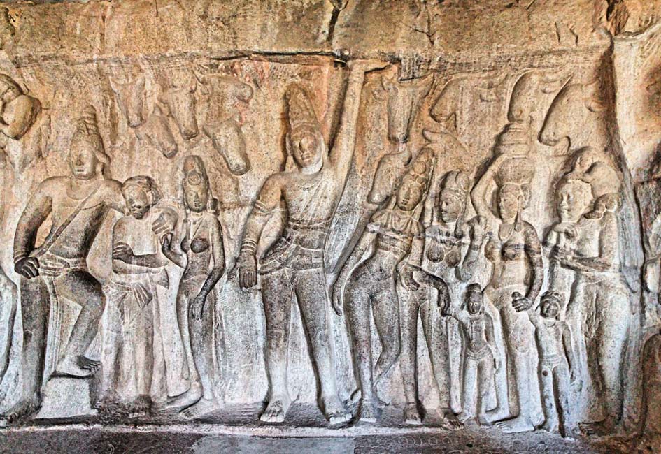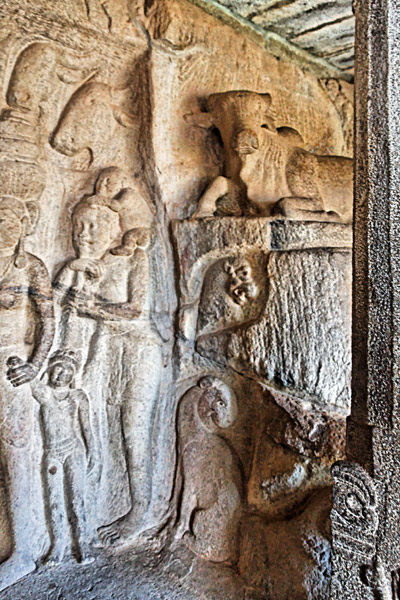 Cette composition est sculptée sur le même rocher que celle dite de la Descente du Gange. Elle est protégée par la construction d'une fausse caverne. Elle représente une scène célèbre au cours de laquelle Krishna soulève une montagne.