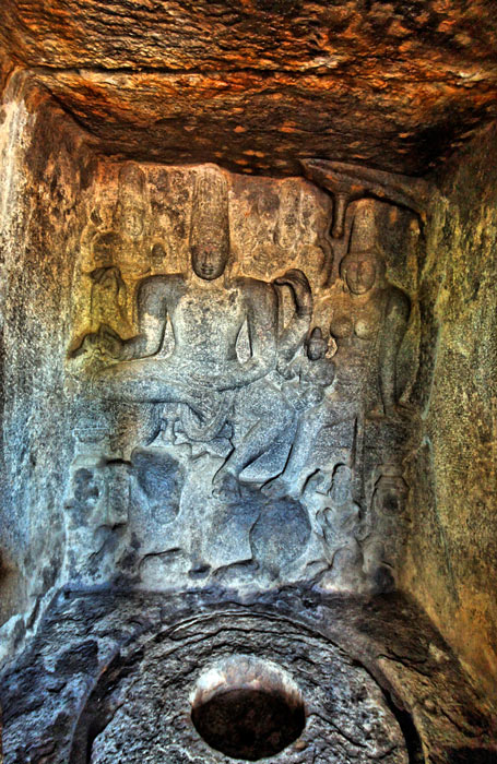 Cette scène couvre le mur du fond de la cella dont le linga a disparu.. Elle représente Shiva et Parvati avec Skanda, fils du seul Shiva. Cette représentation est une allégorie de la famille royale. Dans les inscriptions pallavas, la relation du prince héritier et de son père est assimilée à celle de Shiva et de Skanda Subrahmanya. ( E. Parlier- Renault, 2006)