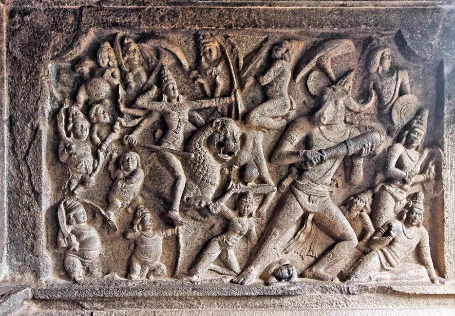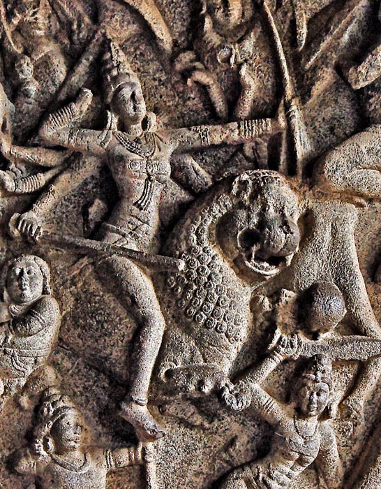 Durga est ici représentée comme Mahisamardini poursuivant le démon-buffle Mahisa. Le dynamisme de cette représentation est marqué par les mouvements obliques donnés aux personnages. Le démon bufflle est anthropomorphe, avec seulement la tête du buffle. Il semble s'arrêter et il tourne la tête vers Durga, comme attendant le coup fatal. La déesse a huit bras et des attributs que vous pouvez mieux voir sur l'image ci-dessous. (A.M. Loth, 2003). La Grande Déesse Devi est une manifestation du pouvoir des dieux. Durga est un aspect terrible et grandiose de la Déesse qui apparaît sous différentes formes. Son combat épique contre le démon buffle "Mahisa" est relatée dans de nombreuses représentations.