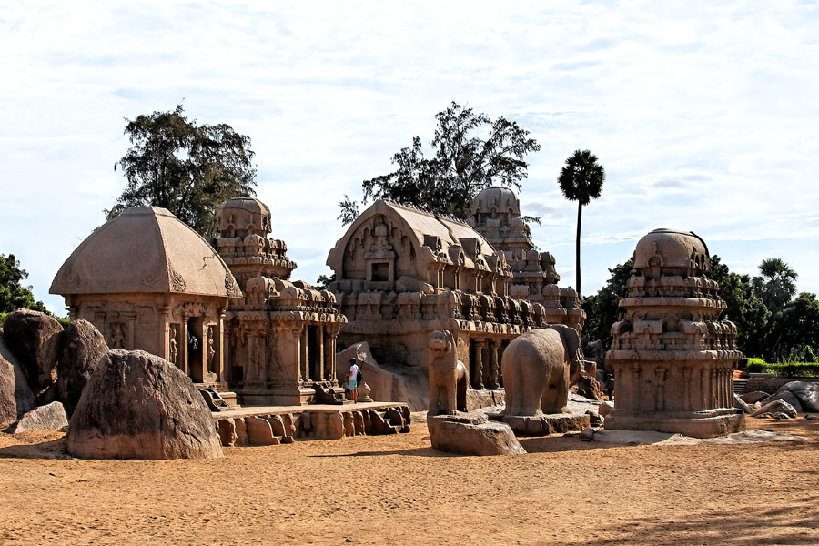 Ces cinq temples monolithes ont été sculptés dans des rocherssous le règne de Mamalla (Narasimhavarman Ier, 630-670). Ils sont appelés Rathas (chars). Consacrés à Shiva, on leur a donné les noms des héros de la grande épopée. (A.M. Loth, 2006). Les deux premiers sur la gauche de l'image reposent sur une plate-forme commune avec des lions et des éléphants sculptés. A.M. Loth, 2006). Un lion et un éléphant ont été sculptés au milieu des temples.