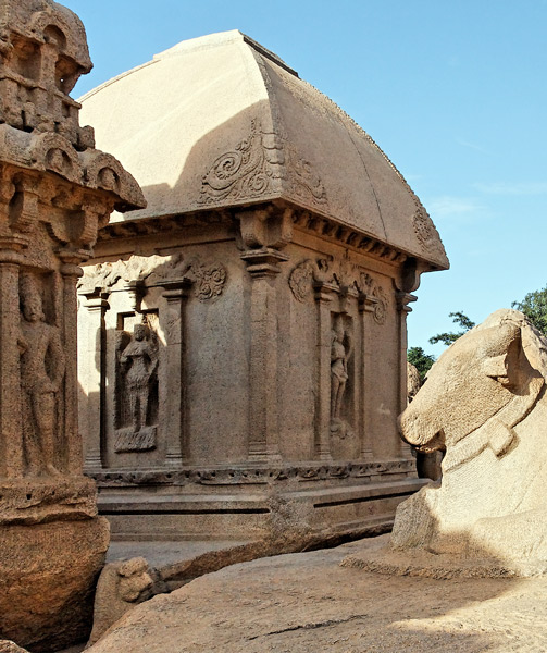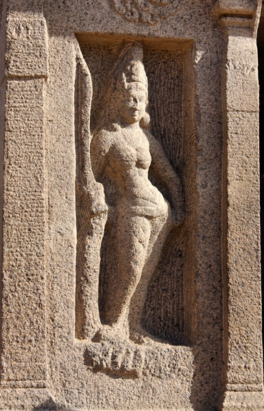 | Ce sanctuaire carré est coiffé d'un dôme à quatre pans orné d'un feuillage luxuriant sur les angles. Cette représentation s'inspirerait d'un modeste temple au toit de branchages. la porte est protégée par des gardiennes tenant un arc (ci-dessus à gauche).A l'intérieur, a été sculptée une représentation de Durga. (A.M. Loth,2003). Le taureau Nandi dont on voit la tête est associé au 2ème temple, l'Arjuna. |