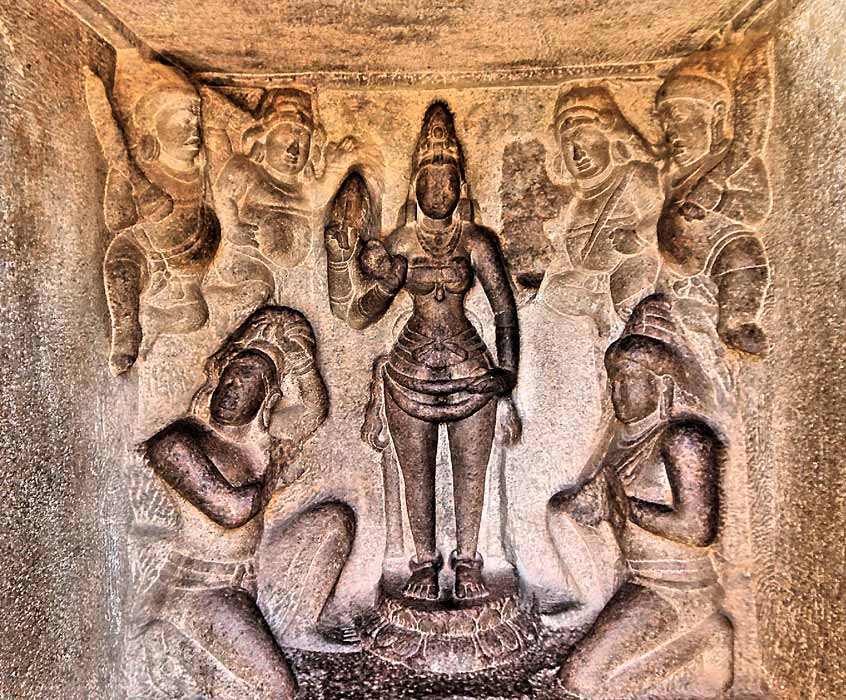 Cette scène est identique, avec quelques variantes, à la scène sculptée dans la grotte Varaha sur le même site. Ici le dévot agenouillé à sa droite est de face. Si l'arme a disparu, on ne sait pas s'il va se couper sa chevelure ou se trancher la gorge. Durga tient un gros bouton de lotus (A.M. Loth, 2003).