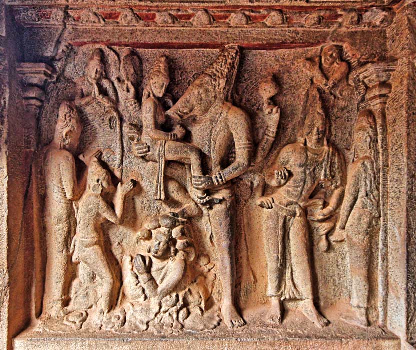 entre deux ères cosmiques. Ananta semble avoir un buste humain. Varaha porte la Terre sur son épaule droite. Plusieurs personnages contemplent l'exploit. On peut remarquer que l'image est symétrique de celles des Chalukyas où Varaha porte Bhumi toujours sur le côté gauche. La sculpture en est aussi plus frustre. Les Pallavas ont représenté ici Varaha, divinité tutélaire des Chalukyas, comme pour en transposer l'aspect protecteur sur eux.
